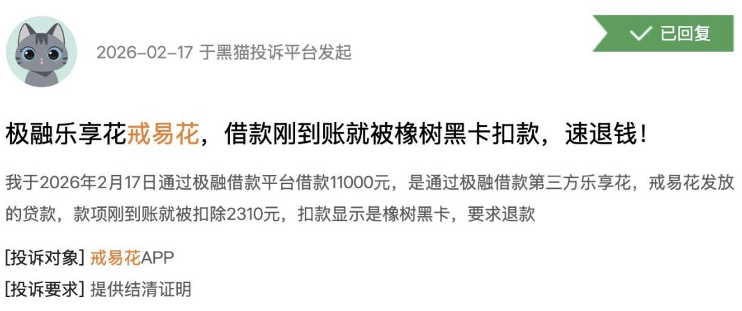 多位借款人反馈,在戒易花申请借款时,自身从未主动勾选会员服务、确认扣费,可借款资金刚到账,就被平台通过第三方支付通道秒扣高额费用。有消费者投诉称,借款11000元被无故扣款2310元,扣款方显示为橡树黑卡。