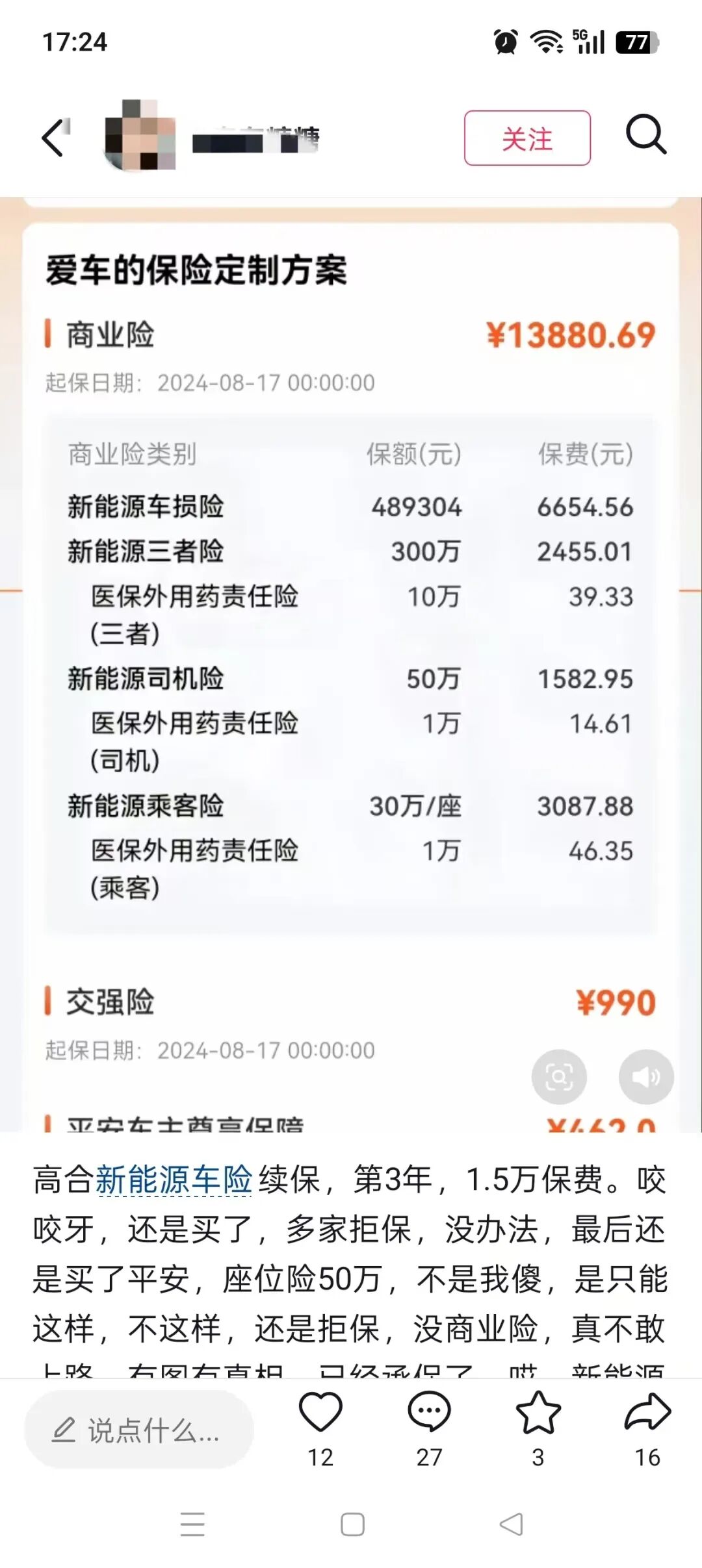 还有高合车主反映,自己遭到多家保险公司拒保,或是必须捆绑50万元的座位险。她晒出的保单显示,车价48.9万元,车损险为6654元。