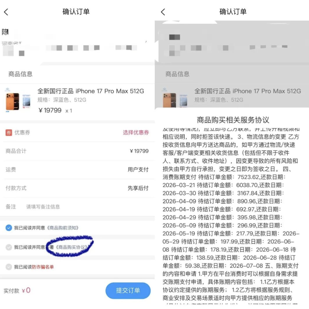 吴天提供的截图显示,在提交订单前,页面有一栏《商品购买协议》,点开协议后才能看到具体账单分期情况。