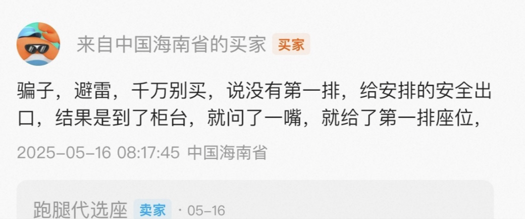一位辽宁的买家留言称,原本定好了靠窗、安全出口双人位置,最后没分配到,商家只退了50元。还有一位海南网友吐槽:“千万别买,(商家)说没有第一排,给安排安全出口的位置,结果到了柜台,就给安排了第一排座位。”