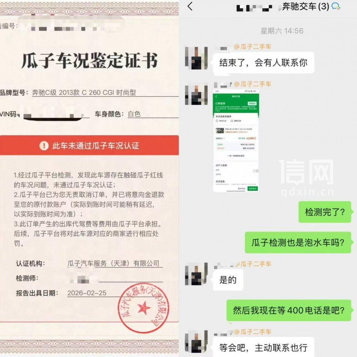 2月28日,张先生向瓜子二手车平台询问检测结果,工作人员承认车辆确为泡水车,并出具了《瓜子车况鉴定证书》,其中注明“经过瓜子平台检测,发现此车源存在触碰瓜子红线的车况问题,未通过瓜子车况认证”,但该鉴定书显示报告出具时间却为2月25日。