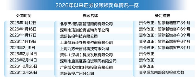 据同花顺iFinD数据统计,2025年,共有46家证券投资咨询机构被监管部门处罚56次(含行政处罚和行政监管措施),同比增长36.59%,其中,两家机构因为严重违规被直接吊销牌照。进入2026年,严监管持续,已经有北京天相财富、九方智投、慧研智投等8家行业知名机构受到处罚,有的甚至被暂停新增客户。