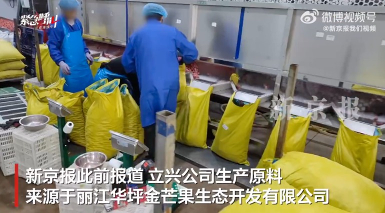 经过溯源,这批问题原料指向位于云南的丽江华坪金芒果生态开发有限公司(以下简称“华坪金芒果”)。公开资料显示,该公司主要从周边地区的种植户手中收购草莓鲜果并进行初级加工。