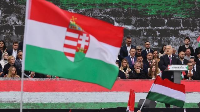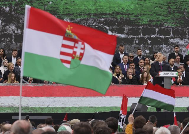 2025年10月23日,匈牙利总理欧尔班(前右)在首都布达佩斯举行的一场集会上讲话。