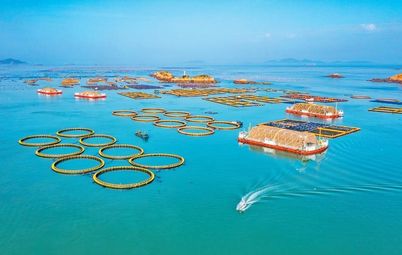 深远海养殖是在深水远岸通过大型现代化渔业装备进行规模化高效养殖的生产方式,为打造“蓝色粮仓”、保障国家粮食安全开辟了全新疆域。图为2025年7月12日拍摄的福建省福州市连江县定海湾“百台万吨”深远海养殖平台。 连江县委宣传部供图 杨柳州/摄