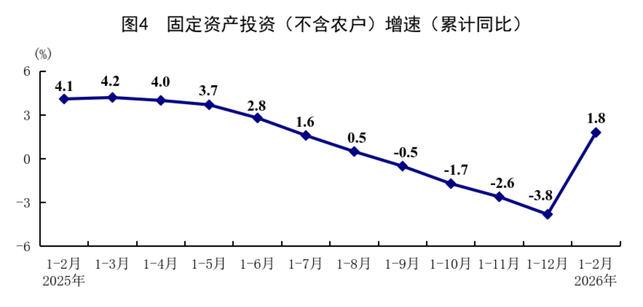 1—2月份,全国固定资产投资(不含农户)52721亿元,同比增长1.8%,上年全年为下降3.8%;扣除房地产开发投资,全国固定资产投资增长5.2%。分领域看,基础设施投资同比增长11.4%,制造业投资增长3.1%,房地产开发投资下降11.1%。全国新建商品房销售面积9293万平方米,同比下降13.5%;新建商品房销售额8186亿元,下降20.2%。分产业看,第一产业投资同比增长17.4%,第二产业投资增长5.4%,第三产业投资下降0.4%。民间投资同比下降2.6%,降幅比上年全年收窄3.8个百分点;扣除房地产开发投资,民间投资增长1.0%。高技术产业投资同比增长5.1%,其中航空、航天器及设备制造业,研发与设计服务业,信息服务业投资分别增长20.2%、20.6%、16.5%。从环比看,2月份固定资产投资(不含农户)比上月增长0.39%。