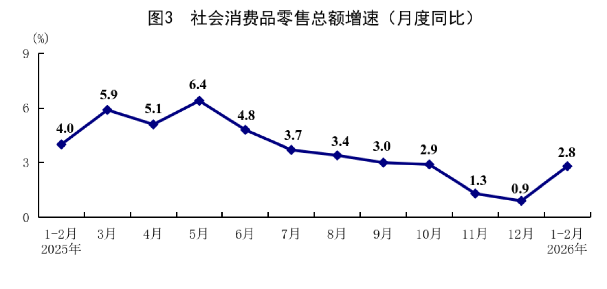 1—2月份,社会消费品零售总额86079亿元,同比增长2.8%,比上年12月份加快1.9个百分点。按经营单位所在地分,城镇消费品零售额74449亿元,增长2.7%;乡村消费品零售额11630亿元,增长3.2%。按消费类型分,商品零售额75815亿元,增长2.5%;餐饮收入10264亿元,增长4.8%。基本生活类和部分升级类商品销售增长较快。限额以上单位服装鞋帽针纺织品类、粮油食品类、通讯器材类、金银珠宝类商品零售额同比分别增长10.4%、10.2%、17.8%、13.0%。从环比看,2月份社会消费品零售总额比上月增长0.81%。1—2月份,服务零售额同比增长5.6%,比上年全年加快0.1个百分点。其中,通讯信息服务类、旅游咨询租赁服务类、文体休闲服务类零售额较快增长。1—2月份,全国网上商品和服务零售额32546亿元,同比增长9.2%。其中,网上商品零售额20812亿元,增长10.3%,占社会消费品零售总额的比重为24.2%;网上服务零售额11734亿元,增长7.3%。