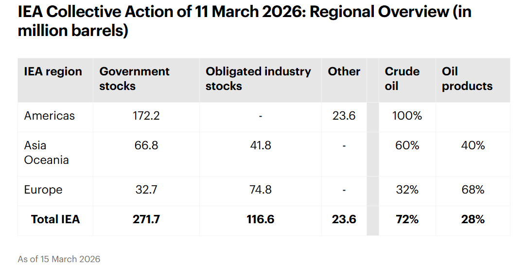 据IEA声明称,在其石油储备释放计划中,2.717亿桶石油来自各成员国政府,1.166亿桶行业储备石油来自义务行业,另有2360万桶石油来自其他来源。