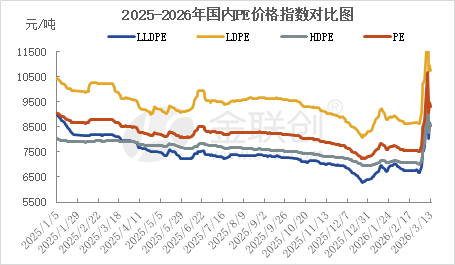 2026年一季度国内PE市场震荡上升,1-2月份,行情以盘整为主,价格上波动不大。期间主要利好支撑,原油高位成本支撑偏强,中东地缘风险积累中,中东进口货源预期减少,国内石化价格相对坚挺;主要利空有,1-2月份元旦、春节假期,下游需求处于淡季,特别是2月份,春节前后需求降至全年最低,国内装置此阶段检修较少,国产供应相对充足。3月份,中东火药桶全面引燃,PE市场经历了一场由地缘政治主导的罕见的剧烈波动行情。2月28日美以对伊朗发动军事打击后,霍尔木兹海峡这一全球能源咽喉实质性关闭,国际油价飙升,成本端的剧烈冲击迅速传导至国内PE市场。现货市场在贸易商投机补库、下游恐慌备货及上游石化全力拉升的推动下,报价大幅跟涨。然而,3月10日随着战争因素弱化、地缘风险溢价快速回吐,行情迅速暴跌,回吐前日大部分涨幅。之后市场围绕着美伊战争、霍尔木兹海峡、中石化降负等消息面反复横跳,剧烈波动。2026年3月13日,国内PE价格总指数9329,较2月28日涨1820,较2月14日涨1770,LLDPE价格指数8554,较2月28日涨1887,较2月14日涨1804,LDPE价格指数10749,较2月28日涨2129,较2月14日涨2109,HDPE价格指数8569,较2月28日涨1551,较2月14日涨1491。