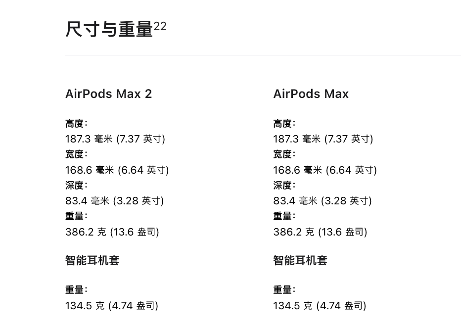 不过对于不少用户反馈“又贵又重”的问题,新款AirPods Max并没有改变。苹果官网显示,AirPods Max 2的重量与前一代完全一致,都是386克,续航也同样是20个小时。