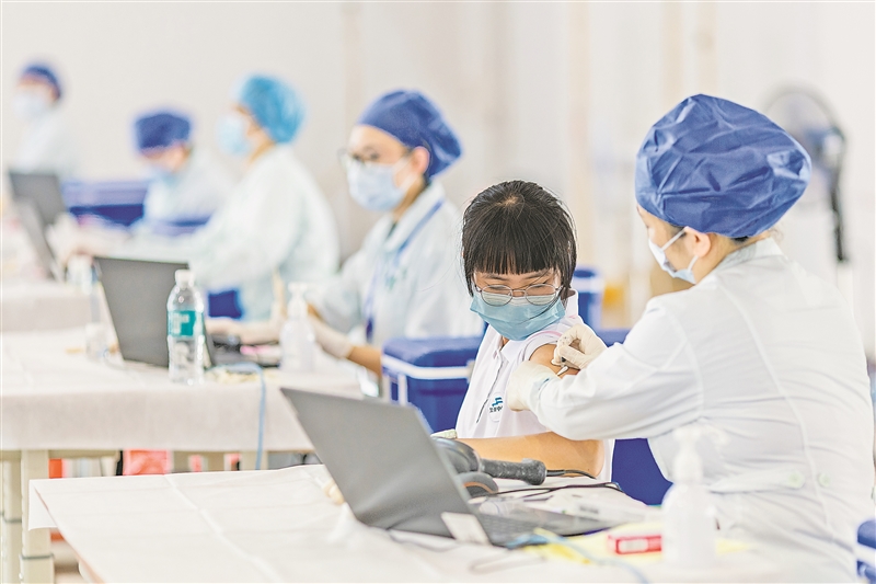医护人员为适龄女生接种人乳头瘤病毒疫苗。