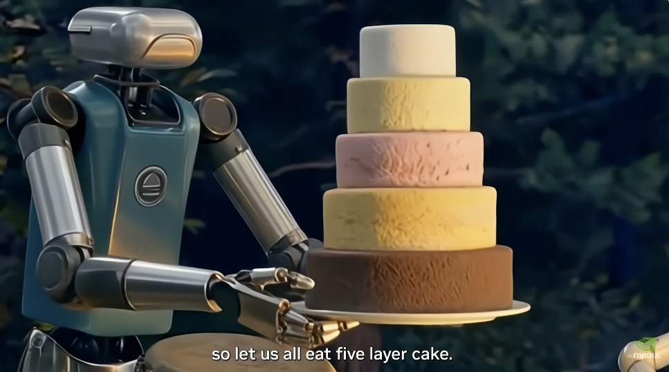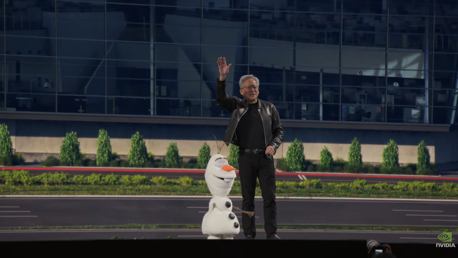 04:30 英伟达与迪士尼的合作也在继续推进——《冰雪奇缘》中的雪宝(Olaf)机器人登上舞台,与黄仁勋一同展示英伟达如何为这一机器人提供技术支持。
