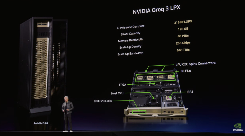 备受关注的Groq LPU系统也登场。这个系统包含8颗LP30 Groq芯片,目前已经进入量产阶段。整套LPX机架包括:256个LPU处理器、128GB片上SRAM,合计640TB/s扩展带宽。