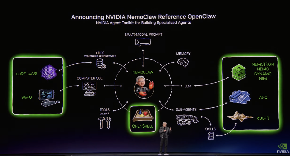 04:04 英伟达的“一键养龙虾”平台NemoClaw亮相。这是能够一键部署的完整技术栈。该系统整合Nemotron模型与OpenShell运行环境。