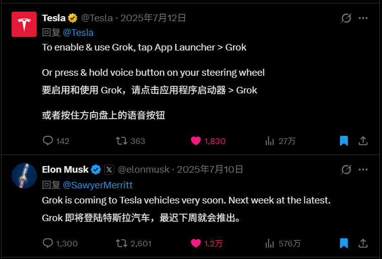 2025年7月10日,马斯克在X(推特)上宣布,Grok即将登陆特斯拉。两天之后,特斯拉官方账号发帖,告诉车主现在只需要按住方向盘上的语言按钮,就能激活Grok。