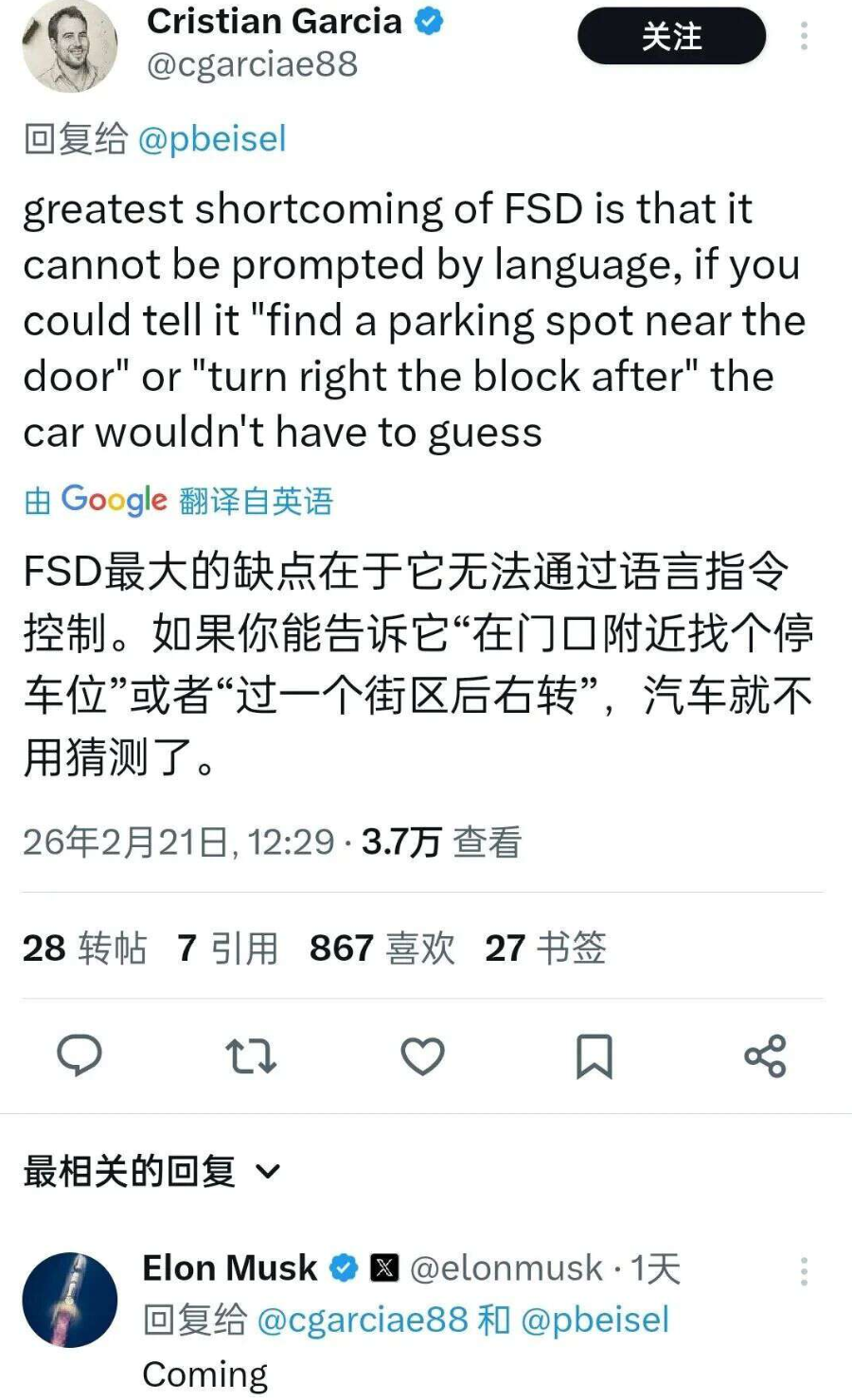2月21日,Google Deepmind 工程师 Cristian Garcia 发推表示:“FSD最大的缺点在于它无法通过语言指令控制。如果你能告诉他‘就在门口附近找个停车位’或者‘过一个街区后右转’,车主和汽车就都不用猜来猜去了”。