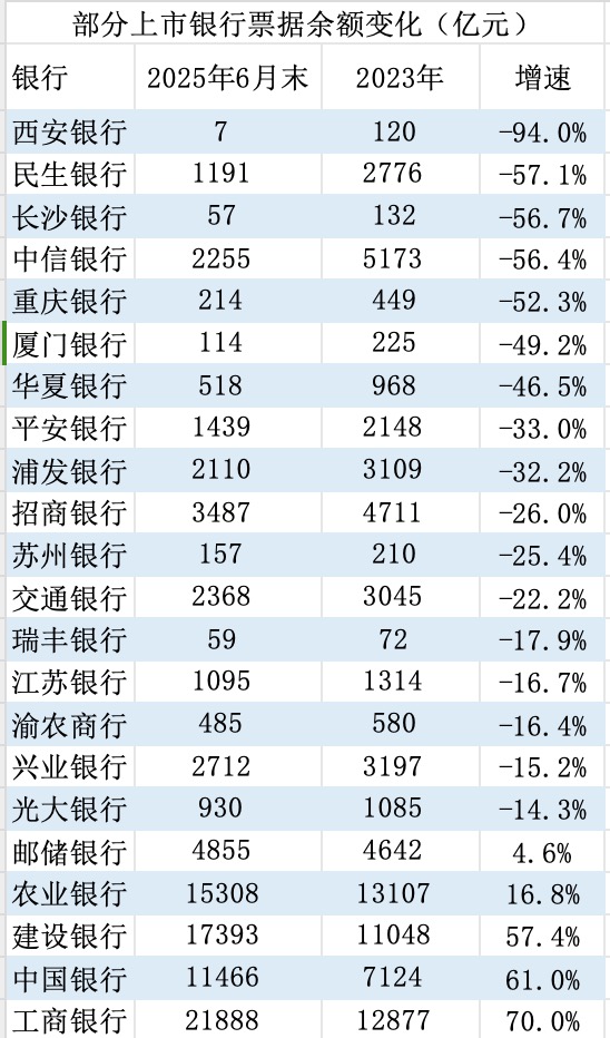 不过,一些银行尤其是四大行的票据贴现余额仍在逆势增长。据界面新闻记者统计,2023年-2025年6月建设银行(601939.SH)、中国银行(601988.SH)、工商银行(601398.SH)票据贴现余额增幅在60%左右。