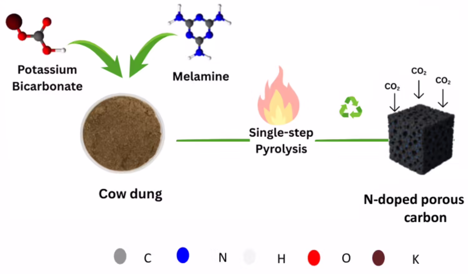 研究人员通过工程化手段制备了氮掺杂多孔碳,这是一种能够吸附二氧化碳的材料。制备过程将牛粪与三聚氰胺(提供氮源)以及碳酸氢钾混合。碳酸氢钾是一种绿色、低腐蚀性且有效的活化剂,用于制造高表面积材料。混合物在无氧条件下于炉中高温加热,这一过程称为热解,最终得到能高效捕获二氧化碳分子的氮掺杂多孔碳。材料中掺入的氮增强了其对二氧化碳的吸引能力。研究人员还通过详细的分子级模拟验证了实验制备的材料,这些模拟方法能够揭示原子和分子随时间的运动规律,探索其可能的构型与性质。