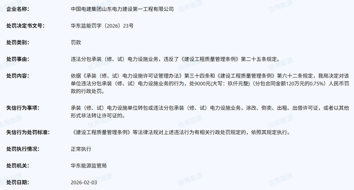 据新黄河报道,2026年2月3日,华东能源监管局作出华东监能罚字〔2026〕23号处罚,认定山东电建一公司存在违法分包承装(修、试)电力设施业务行为,违反《建设工程质量管理条例》第二十五条规定,依据《承装(修、试)电力设施许可证管理办法》第三十四条及《建设工程质量管理条例》第六十二条,对其处以9000元罚款,罚款金额为对应分包合同金额120万元的0.75%。