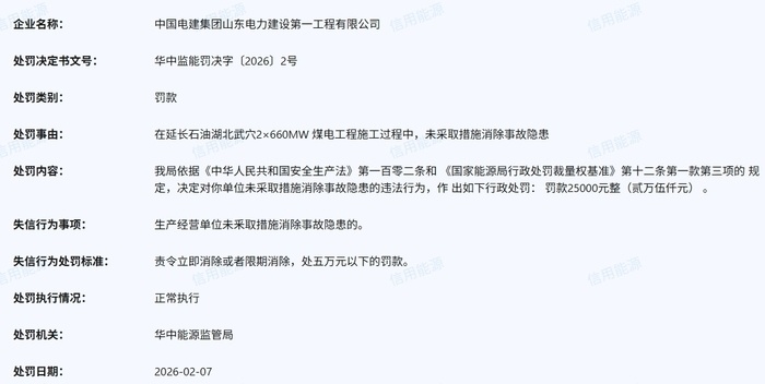 2026年2月7日,华中能源监管局下达华中监能罚决字〔2026〕2号处罚决定书,查明该公司在延长石油湖北武穴2×660MW煤电工程施工过程中,未采取措施消除事故隐患,依据《中华人民共和 国安全生产法》第一百零二条与《国家能源局行政处罚裁量权基准》相关规定,对其罚款25000元。