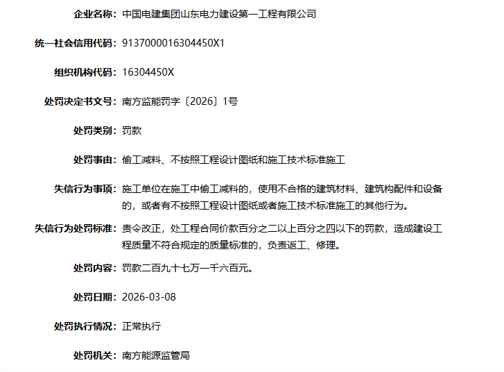 近日,国家能源局资质和信用信息系统处罚信息显示,中国电建集团山东电力建设第一工程有限公司因偷工减料、不按照工程设计图纸和施工技术标准施工,被南方能源监管局罚款2971600元。
