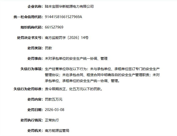 近日,国家能源局资质和信用信息系统处罚信息显示,陆丰宝丽华新能源电力有限公司因未对承包单位的安全生产统一协调、管理,被南方能源监管局责令限期改正并罚款5万元。