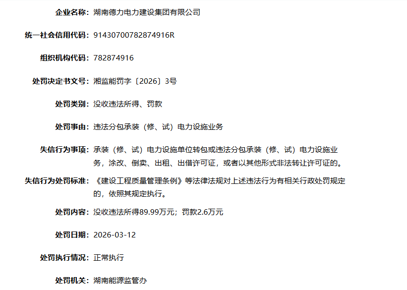 近日,国家能源局资质和信用信息系统处罚信息显示,湖南德力电力建设集团有限公司因违法分包承装(修、试)电力设施业务,被湖南能源监管办没收违法所得89.99万元并罚款2.6万元。