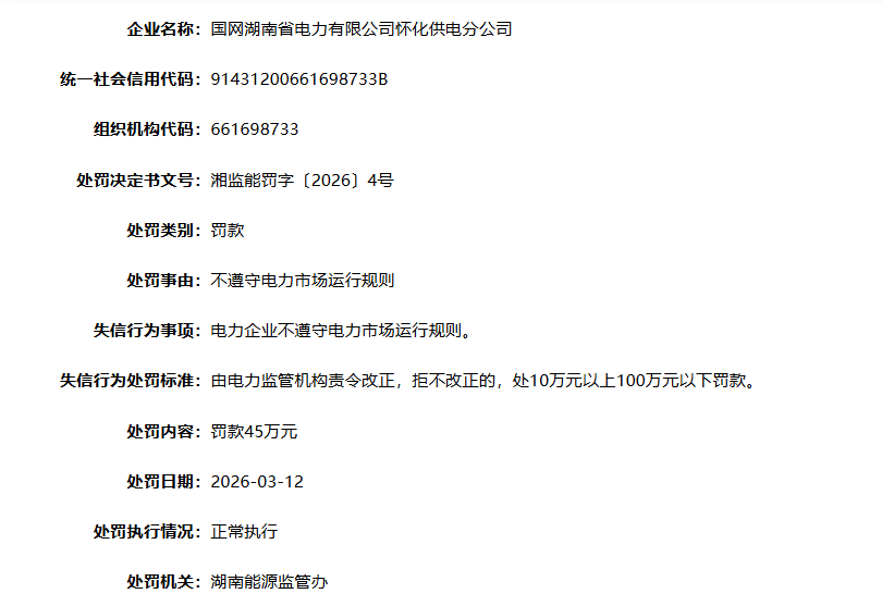 近日,国家能源局资质和信用信息系统处罚信息显示,国网湖南省电力有限公司怀化供电分公司因不遵守电力市场运行规则,被湖南能源监管办罚款45万元。