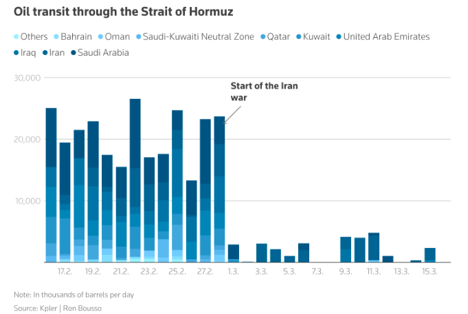 数据分析公司Kpler的数据显示,去年欧洲约占通过霍尔木兹海峡运出的中东航空煤油出口量的四分之三——约每天37.9万桶——但自战争开始以来,没有任何此类货物通过海峡。