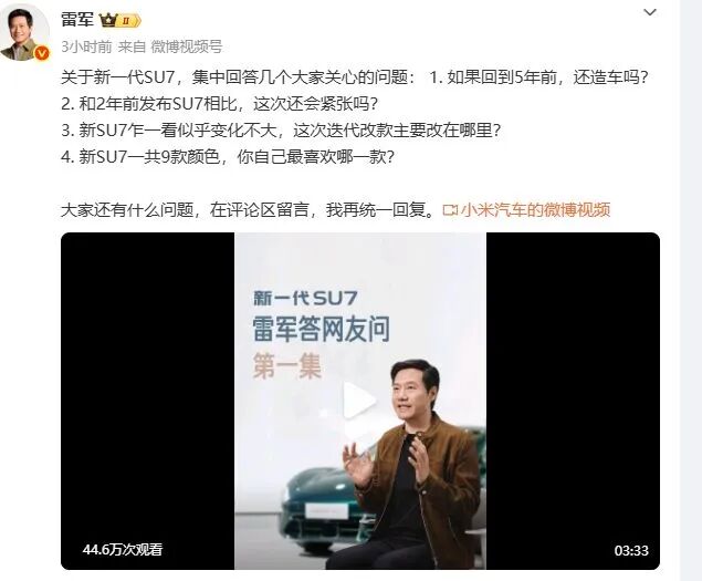 随着新一代小米SU7进入上市倒计时,小米集团创始人、董事长兼CEO雷军近期持续为其“造势”。