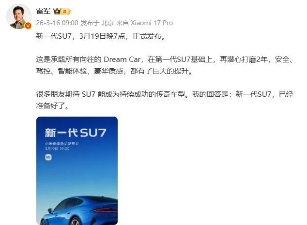 3月16日,雷军通过个人微博官宣新一代SU7将于3月19日晚正式发布(即上市)。“这是承载所有向往的Dream Car,在第一代SU7基础上,再潜心打磨两年,安全、驾控、智能体验、豪华质感,都有了巨大的提升。”雷军称,“很多朋友期待SU7能成为持续成功的传奇车型,我的回答是:新一代SU7,准备好了。”