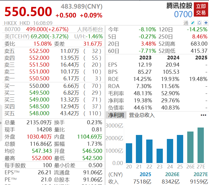 二级市场上,腾讯控股港股收盘涨0.09%报550.5港元/股,最新市值为50130亿港元。
