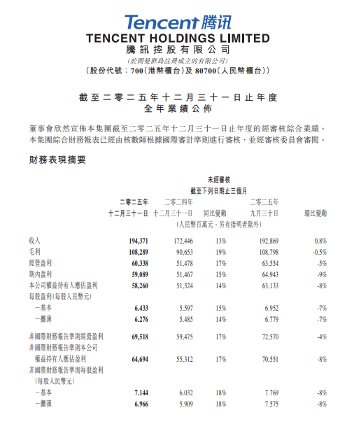 3月18日盘后,腾讯控股发布2025年第四季度及全年财报。腾讯控股公告称,第四季度营收1,943.7亿元人民币,同比增长13%,预估1,940.7亿元人民币;净利润582.6亿元人民币,预估550.5亿元人民币,调整后净利润646.9亿元人民币,同比增长17%,预估649.3亿元人民币。公司权益持有人应占盈利582.6亿元,同比增长14%。