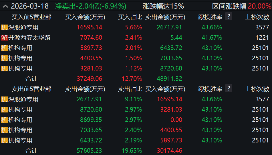 3月18日,朗科科技再度“20cm”涨停,全天换手率达25.49%。龙虎榜数据显示,上榜营业部席位全天合计净卖出2.04亿元。具体来看,机构合计净卖出1.73亿元;此外,深股通专用、开源证券西安太华路证券营业部分别买入1.66亿元、7074.60万元;深股通专用、开源证券西安太华路证券营业部分别卖出2.67亿元、5.44万元。