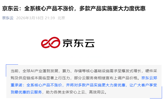 3月18日晚间,京东云发文,承诺全系核心产品不涨价,并将对多款产品实施更大力度优惠,助力各类主体安心上云、高效用云。