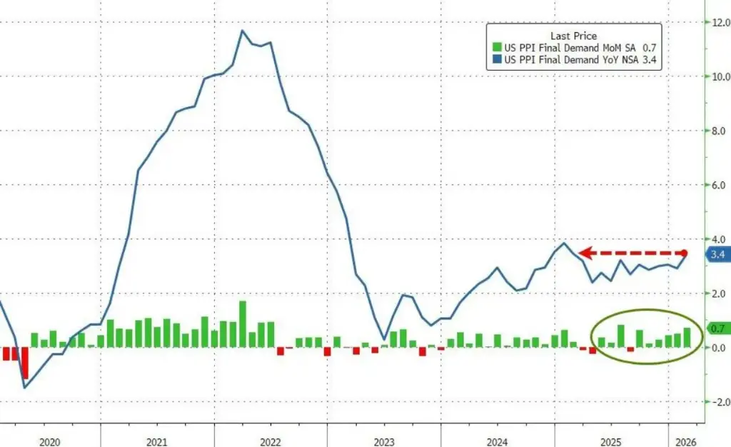 数据显示,美国2月生产者价格指数(PPI)环比上涨0.7%,预期值为0.3%,前值为0.5%;同比涨幅达到3.4%,创下一年来新高,预期值为2.9%。