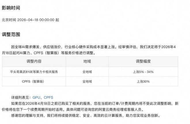 根据阿里云官网发布的公告,本次价格调整涉及多条核心产品线:平头哥真武810E等算力卡产品价格上调5%至34%,文件存储产品CPFS(智算版)涨幅达30%。新价格将于一个月之后的4月18日起生效,此前已购买相关服务的用户不受此次调价影响。