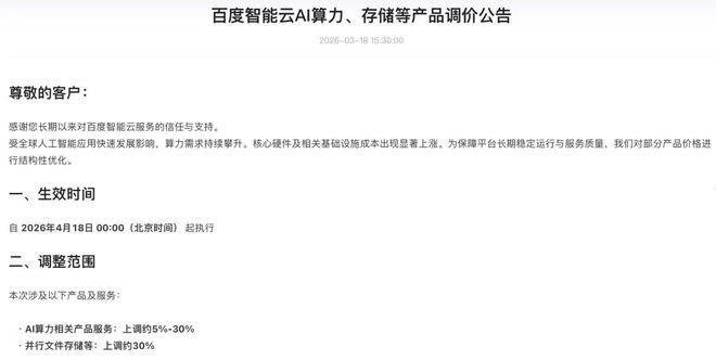 值得一提的是,在3月18日阿里云宣布涨价之后数小时,百度智能云迅速跟进,其在公告中明确表示,调价原因是 “受全球人工智能应用快速发展影响,算力需求持续攀升”,调整范围同样聚焦 AI 算力产品和文件存储 —— 其中,AI 算力相关产品服务上调约 5%—30%,并行文件存储等上调约30%。
