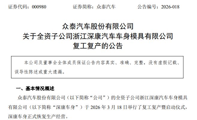 红星资本局3月18日消息,众泰汽车(000980.SZ)于18日晚间发布公告称,公司的全资子公司浙江深康汽车车身模具有限公司(以下简称“深康车身”)于3月18日举行了复工复产暨启动仪式,正式恢复生产经营。