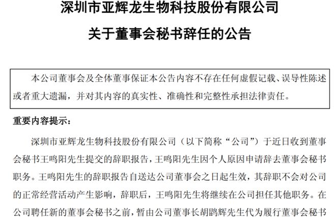 同日,亚辉龙公告称,董事会秘书王鸣阳因个人原因辞职,辞职后将继续在公司担任其他职务,暂由公司董事长胡鹍辉代为履行董事会秘书职责。