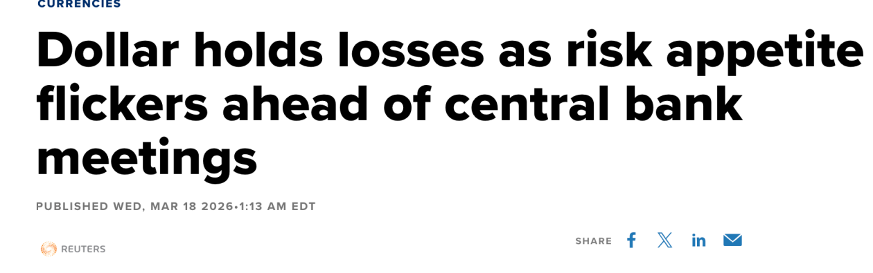 据路透社消息,3月18日随着一系列关键央行决策公布前,市场风险偏好略有回升,美元维持跌势。欧元在欧洲央行晚些时候召开会议前,连续两日上涨后持稳。
