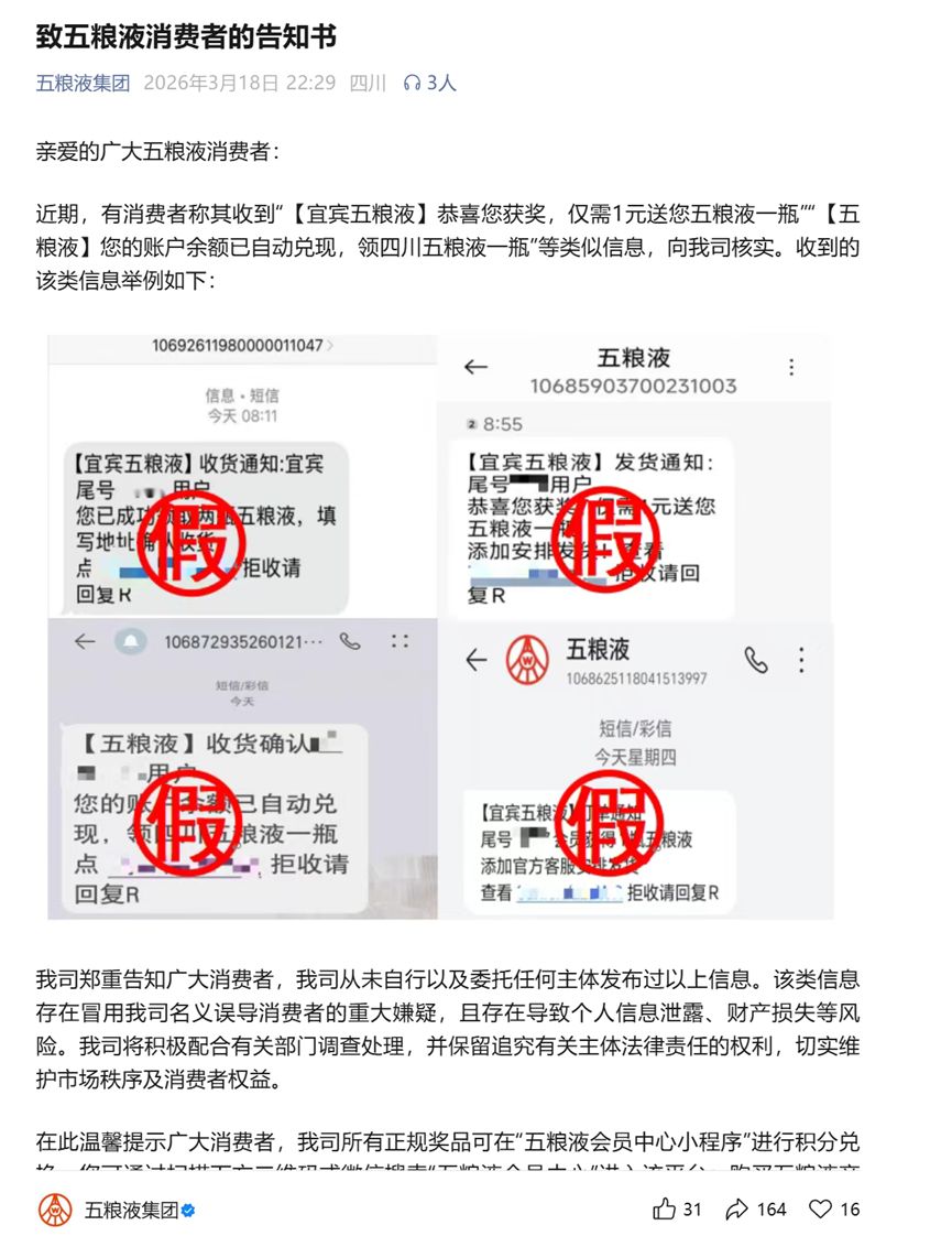 告知书显示,近期,有消费者称其收到“【宜宾五粮液】恭喜您获奖,仅需1元送您五粮液一瓶”“【五粮液】您的账户余额已自动兑现,领四川五粮液一瓶”等类似信息,向公司核实。