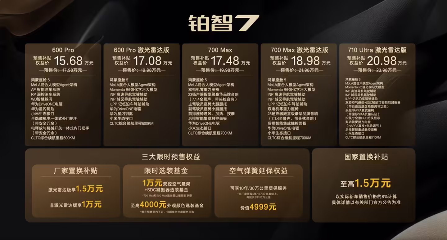 此外,该车采用全场景智慧座舱解决方案,搭载鸿蒙座舱 5、MoLA 混合大模型 Agent 架构、一碰传技术、华为星闪钥匙、小米车载智能软硬件生态。