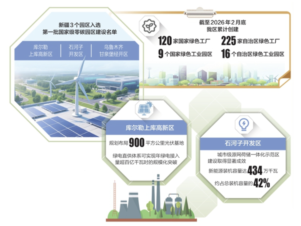 2025年年底,我国第一批国家级零碳园区建设名单发布,库尔勒上库高新技术产业开发区(以下简称“上库高新区”)、石河子经济技术开发区(以下简称“石河子开发区”)、乌鲁木齐甘泉堡经济技术开发区3个园区入选,成为新疆落实国家“双碳”战略、推动绿色转型的重要抓手。