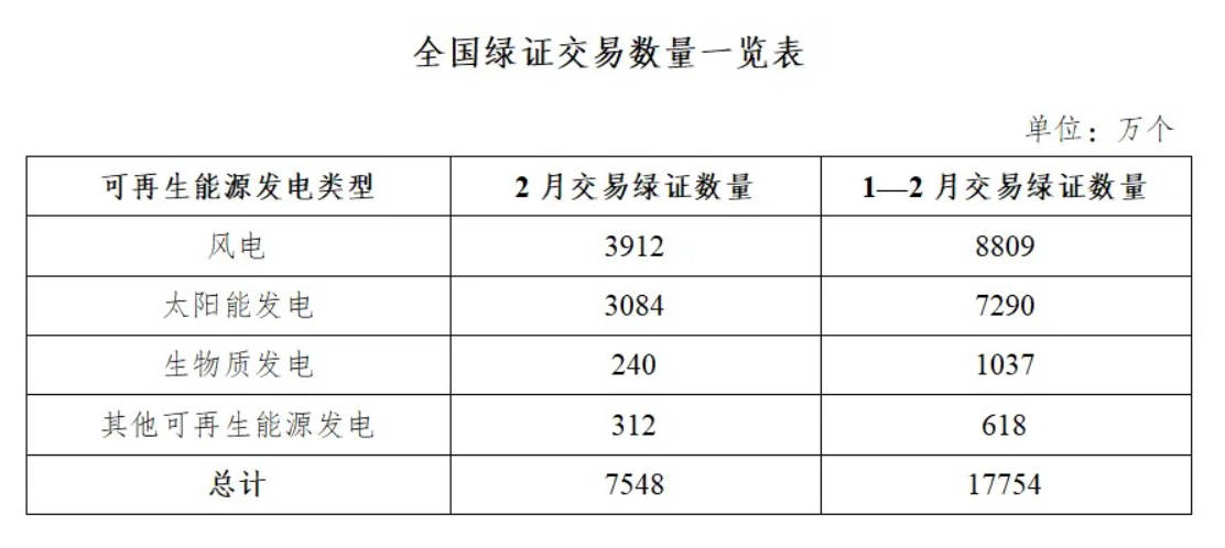 2026年2月,全国交易绿证7548万个,其中绿色电力交易绿证2996万个。