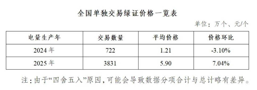 2026年2月,全国单独交易绿证4552万个,其中电量生产年为2024年的绿证交易722万个,平均价格1.21元/个;电量生产年为2025年的绿证交易3831万个,平均价格5.90元/个。