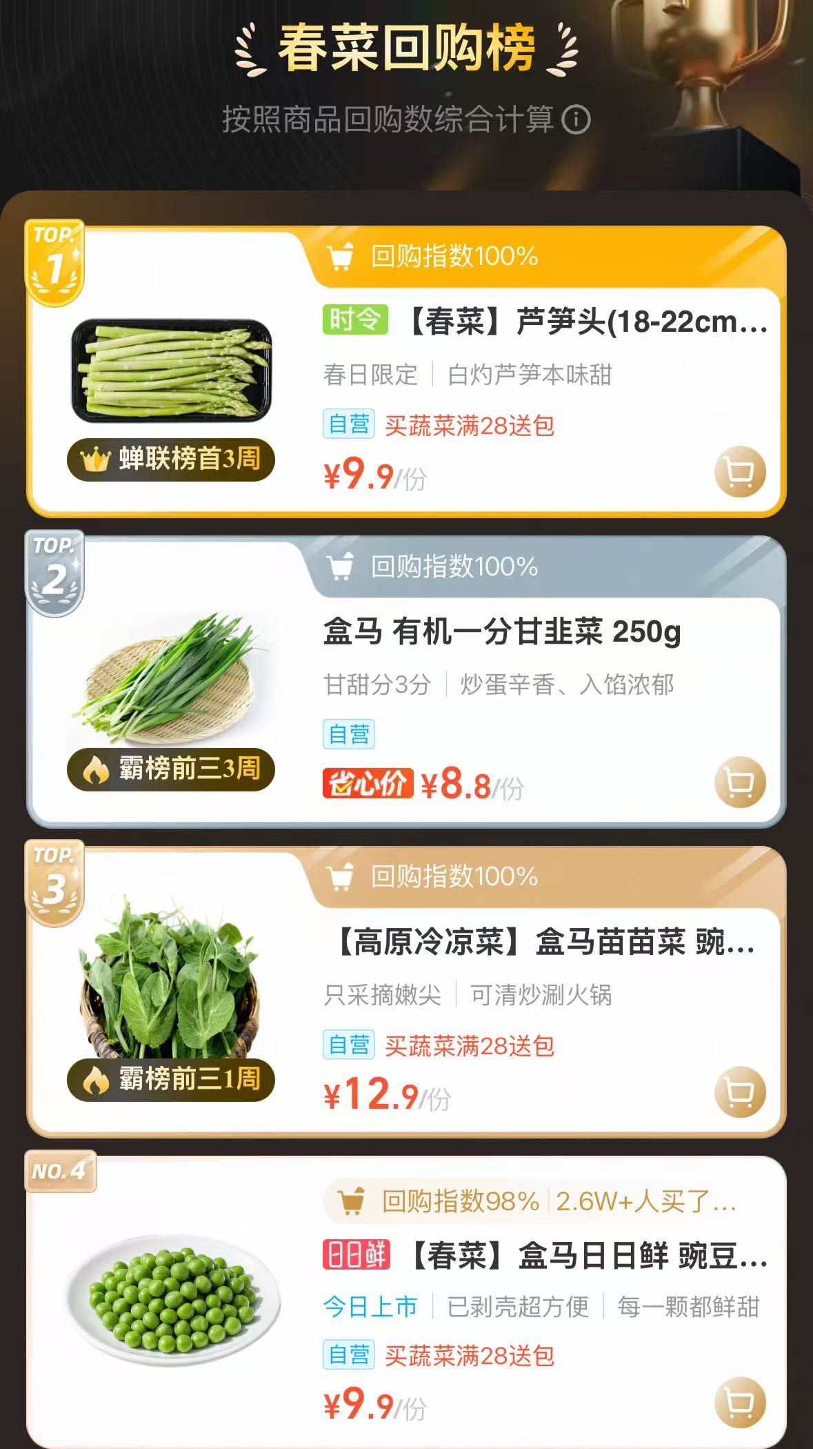 除线下超市外,盒马App、京东七鲜App、美团小象超市还分别推出“春菜回购榜”“春菜尝鲜榜”“春菜热卖榜”等榜单。其中,售价9.9元/份(200克)的芦笋头已蝉联盒马“春菜回购榜”榜首三周;售价5.33元/份(250克)的新蒜苔,在小象超市“春菜热卖榜”排名第一,截至18日已有5800人回购,其次是售价9.9元/份(200克)的芦笋头、售价6.99元/份(100克)的红香椿。