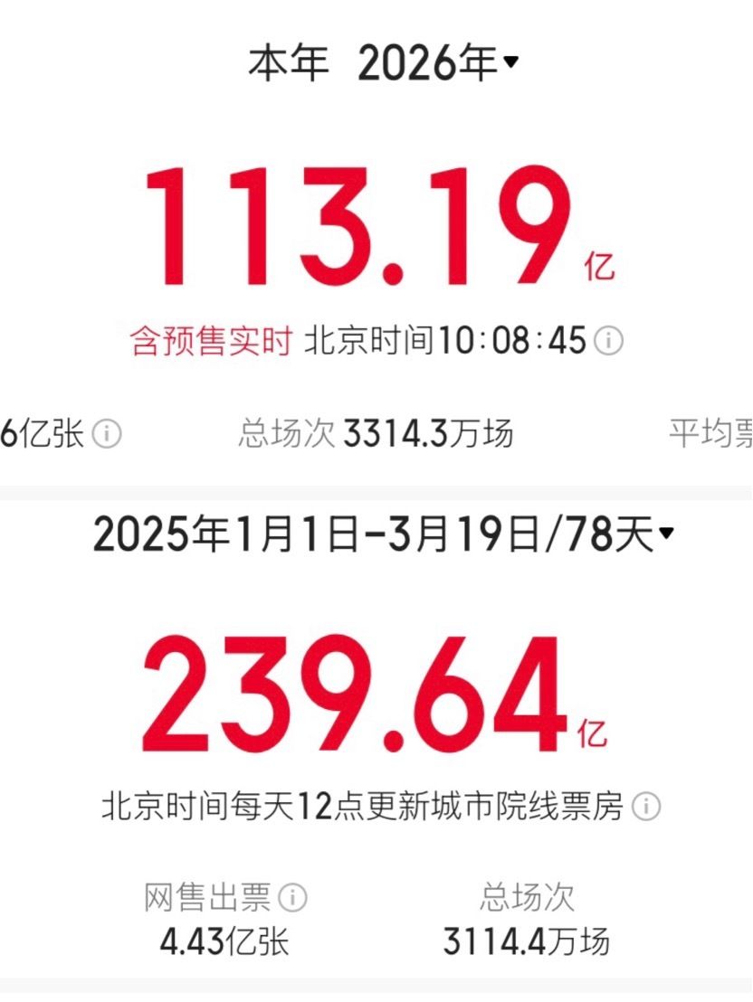 截至3月19日,据猫眼专业版,2026年度电影总票房113.19亿元,比2025年同期的239.64亿元缩水52.8%。