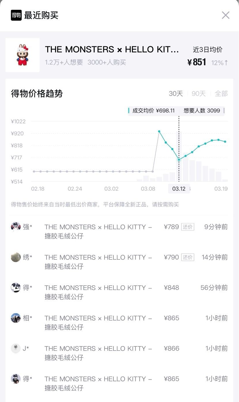 没抢到的粉丝只能转向二手市场。得物平台数据显示,这款公仔发售后价格一度涨到近1000元,几天后略有回落,但直到3月19日仍稳定在850元左右,溢价超过40%。