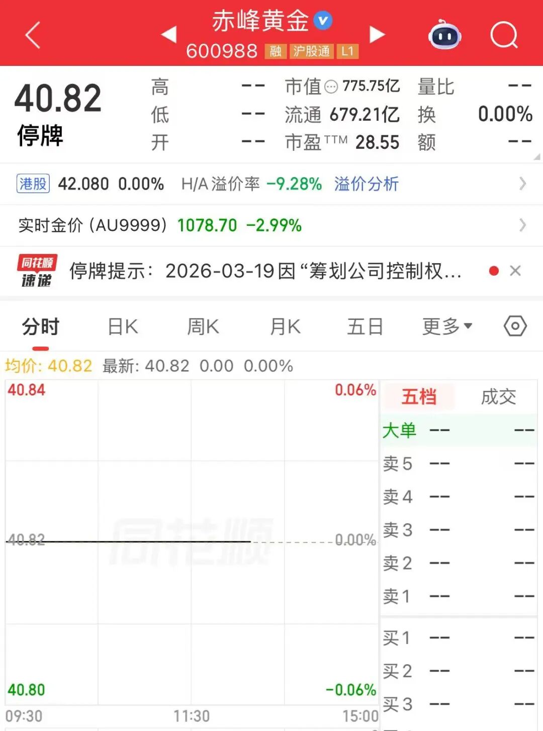 停牌前最后一个交易日(3月18日),赤峰黄金A股收盘价为40.82元/股,总市值为775.7亿元。